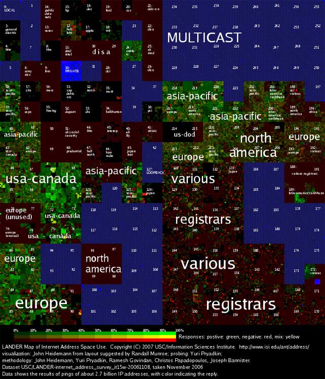 The colors in the Internet map above represent census of all allocated addresses where each address was sent an ICMP ping message and results were recorded. Brighter colors indicate more replies, darker, fewer. Greener means more positive replies (“yes, I’m here”), redder indicates more negative replies (“not allowed”, “router but no host”, etc.). Yellow indicates a mix of positive and negative replies. Blue indicates areas that were not probed because they were not public, allocated, unicast address space. (Source: University of Southern California’s Information Sciences Institute)