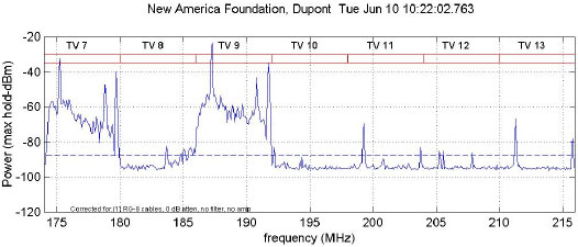 Today, almost all radio spectrum has been licensed to someone although most spectrum is unused most of the time, even in major metropolitan areas. Obviously there are a lot of unused TV channels in any one city, as illustrated by these energy measurements in Washington DC’s Dupont Circle: