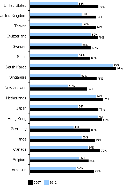 Five countries exceeded 60 percent broadband penetration into the home in 2007; and, this is expected to grow to 17 countries by 2012. The five countries with broadband penetration into the home above 60 percent are Canada, Netherlands, Switzerland, South Korea and Hong Kong.