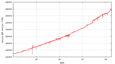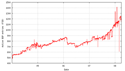 But the wheel has turned some more in the intervening six years, and the pace of growth of the internet has once more picked up. Since 2005 we’ve been consuming IPv4 addresses at a rate of some 160 million addresses per year, and what’s left in the IPv4 unallocated address pool looks like lasting for no more than another 3 years. This situation looks a lot like Peak IPv4, where the rate of expansion of the Internet has never been as high as it has been in the past couple of years, and the IPv4 address consumption rate is also at all-time peak levels in recent months, while at the same time we draw inexorably closer to the exhaustion of the current supply feed from the unallocated IPv4 address pool. So, in 2008, we are visibly running out of IPv4 address space and the timeline to exhaustion is now a couple of years rather than a couple of decades.