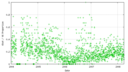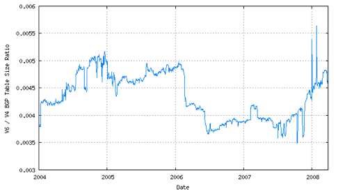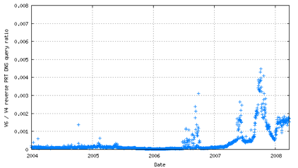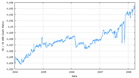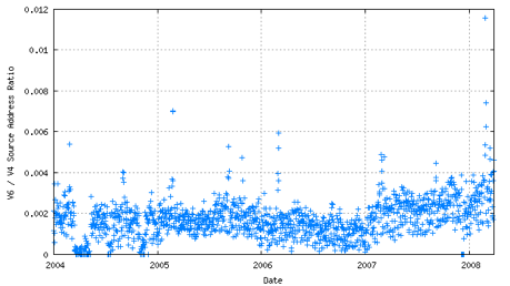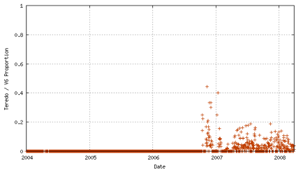 Figure 9 shows the daily ratio of Ipv6 to IPv4 source addresses that are accessing the web site since 1 January 2004.