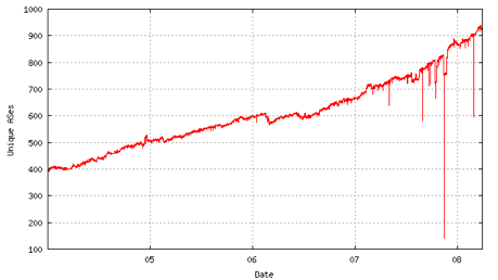 This plot shows a more even picture of IPv6 deployment than the number of IPv6 routing table entries would suggest from Figure 1. It shows a larger than doubling in growth in the number of these routing entities, from 400 to 930 over this 4 year period. Also discernable in the data is the acceleration in growth from mid 2007, although its not as prominent a feature of the overall data sequence.
