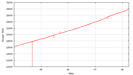 This data indicates a consistent and steady enrolment of new entities that are announcing routes into the IPv6 network, and while there is no spectacular exponential trend in the data so far its also that case that the Ipv6 network continues to grow. Again, this IPv6 data can be compared to the number of unique ASes that were visible in the IPv4 routing table over the same period. Figure 5 shows a comparable plot for the number of ASes in the IPv4 network. In terms of the number of ASes the IPv4 network did not quite double in size over this period, increasing from 16,000 ASes to 28,000 ASes. The relative smoothness of the IPv4 data series indicates a very high level of relative stability in the network. One potential explanation of this data is that the underlying inter-AS topology of the Internet in IPv4 is very stable, and much of the churn in routing may be attributable to the effects of other measures, such as traffic engineering or local efforts to optimise certain aspects of routing policies.