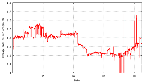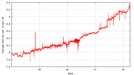 The reason for the order of magnitude level of difference in metrics between the routing table size ratio and the AS number count ratio appears to have more to do with the inherent fragmentation of the IPv4 routing table. Due to the large scale use of more specific routes as a means of supporting traffic engineering and route policy expression, the IPv4 routing space shows a steadily increasing average number of routing entries per origin AS over this 4 year period. The following plot in Figure 7 shows the average number of advertised entries per origin AS in IPv4. The average number of routing entries per origin AS has grown from around 7.9 to 9.3 entries, and the growth rate appears to have increased sharply in 2008.
