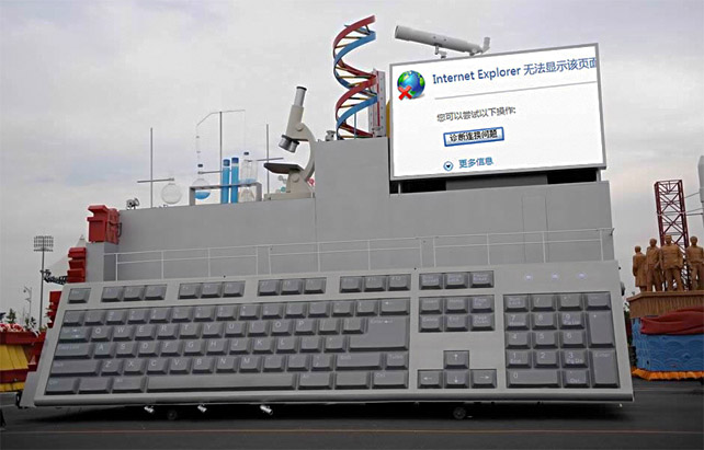 Last week the China Digital Times reported that the photo below has been making the rounds in Chinese blogs and chatrooms. It is an image of a “computer science float” for Thursday’s National Day parade, onto which somebody has photoshopped a screenshot of the Internet Explorer error message familiar to anybody who has ever tried to access a blocked website in China: “This page cannot be displayed.”