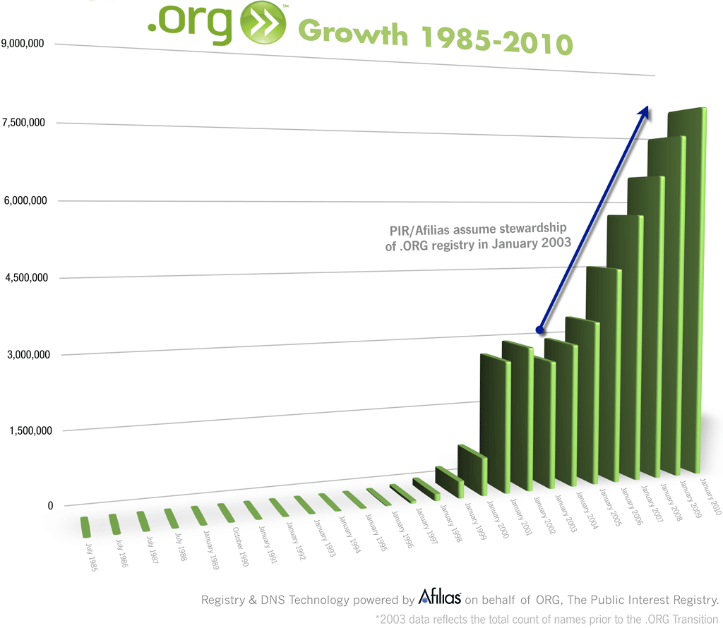 Since 2003, when PIR became the steward of .ORG, .ORG has grown by almost 300% to over 8 million domains. This growth is a testament to the dedicated and focused team at PIR, the secure and reliable technology underpinning the registry, and to the engaged base of active registrars, who serve the expanding core of .ORG registrants and the larger universe of .ORG Internet users. The achievements of .ORG over the past twenty-five years in general and the seven years in particular point to a great renaissance and a period of extraordinary activity and success for .ORG, and bode well for the next twenty-five years.