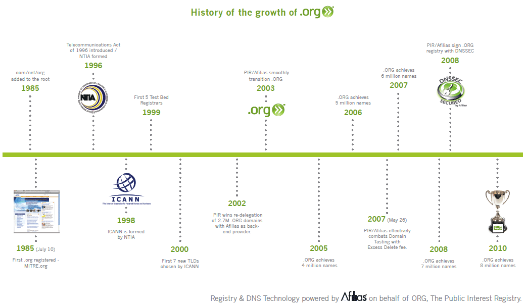 On July 10, 1985 the first .ORG domain name (mitre.org) was registered, joining the initial registrations in .com and 5 other “generic top level domains” in the Internet’s Root zone. This date marks the starting point of the Internet revolution by allowing Internet users to locate online resources by easy-to-remember names instead of complex numbers. Making the Internet more accessible has spurred global economic development, improved freedoms and increased access to knowledge for the last 25 years.