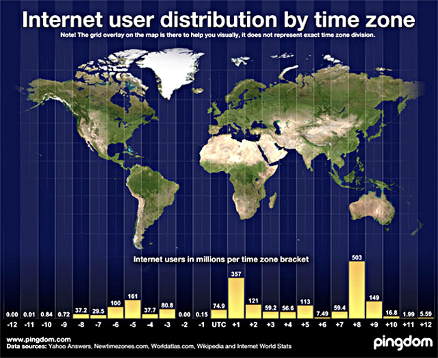 Pingdom has conducted a study on how today’s two billion internet users around the world are spread over different time zones. Study found two time zones stand head and shoulders above the others in terms of the amount of Internet users they contain: UTC+8, which passes through eastern Asia, and UTC+1, which passes through Europe and Africa.