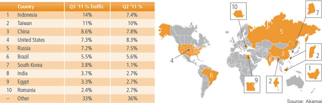 From the report: During the third quarter of 2011, Akamai observed attack traffic originating from 195 unique countries/regions, up from 192 in the second quarter. After making its first appearance in the top 10 list in recent memory in the second quarter, Indonesia vaulted to the top of the list this quarter, generating 14% of observed attack traffic. Myanmar, which had suddenly appeared at the top of the list in the prior two quarters, disappeared from the list just as suddenly in the third quarter, potentially indicating that the attack traffic that had been observed originating from the country has either been shut down, or is now coming from other places. With Myanmar dropping out of the top 10 list, South korea moved into it, more than tripling its observed level of attack traffic, responsible for 3.8% in the third quarter. In addition to South korea and Indonesia, Taiwan, China, India, and Egypt were all responsible for higher percentages of attack traffic as compared to the prior quarter.
