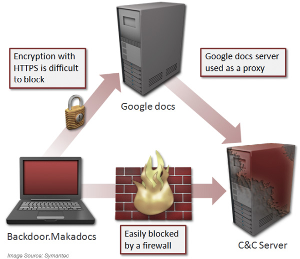 “Google docs has a function called viewer that retrieves the resources of another URL and displays it. Basically, this functionality allows a user to view a variety of file types in the browser. In violation of Google’s policies, Backdoor.Makadocs uses this function to access its C&C server. It is possible that the malware author has implemented this functionality in an attempt to prevent the direct connection to the C&C;from being discovered. The connection to the Google docs server is encrypted using HTTPS, thereby making it difficult to be blocked locally. It is possible for Google to prevent this connection by using a firewall. “
