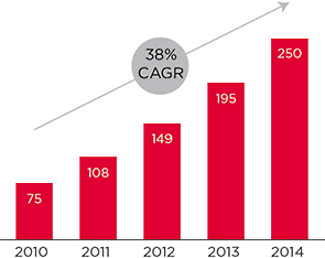 Global M2M connections (million) – 38% Compound Annual Growth Rate