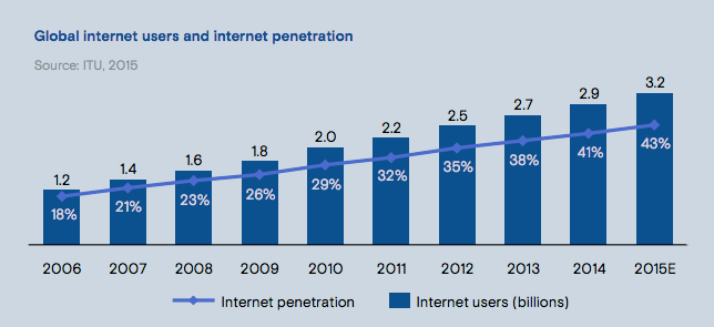 At the end of 2015, 3.2 billion people were estimated to be online—up from 3 billion in 2014, according to the study conducted by Connectivity Lab at Facebook. The increase is “partly attributed to more affordable data and rising global incomes in 2014.” Additionally most people are connecting to the internet using mobile devices, the only way to get online in many parts of the world, notes the report.