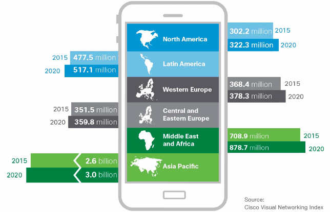 • From 2015 to 2020, global mobile data traffic will grow two times faster than global fixed IP traffic.