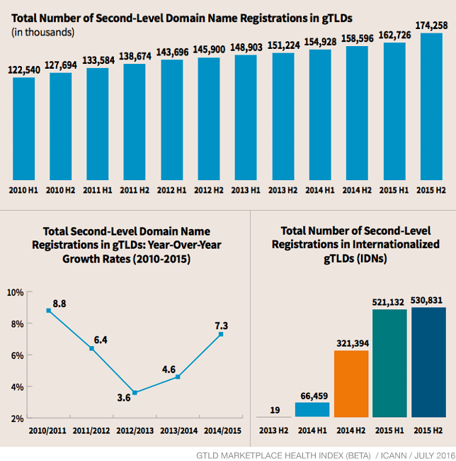 — Total gTLDs: ICANN has provided the metrics below representing the total number of second-level domain names in existence in gTLDs from 2010-2015. Additional metrics track the total number of second-level domain name registrations in internationalized gTLDs (IDNs) and the year-over-year growth rates in all second-level domain name registrations in gTLDs from 2010-2015.