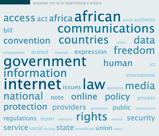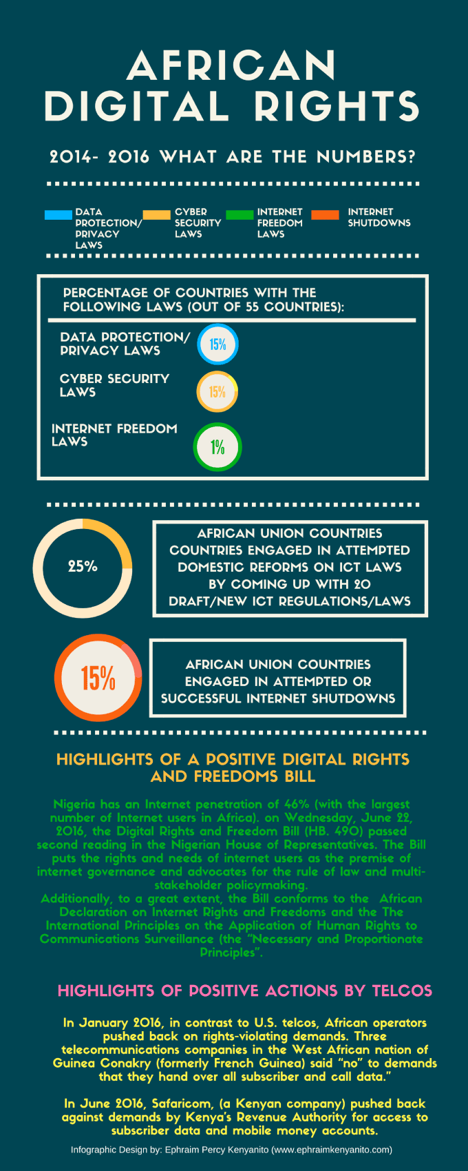 African Digital Rights, designed by Ephraim Percy Kenyanito (Click to Enlarge)Over the past three years, there have been key policy and advocacy processes across the world that have both direct and indirect implications on African Internet governance and ICT policymaking processes, including: African Union Agenda 2063; African Convention on Cyber Security and Personal Data Protection; NETmundial; the African Declaration of Internet Rights and Freedoms; the Feminist Principles of the Internet; International Telecommunication Union (ITU); ICANN events in Africa; the renewal of the UN Human Rights Resolution on the Internet; Global Forum on Cyber Expertise; the BRICS Summit; the Open Government Partnership; Freedom Online Coalition; and the Community of Democracies. The existence of these processes show the importance of access to the Internet to the advancement of socio-economic, political, and gender rights in Africa. In sum, Africa is on a trajectory toward better Internet access but on a downward trajectory in terms of human and digital rights.