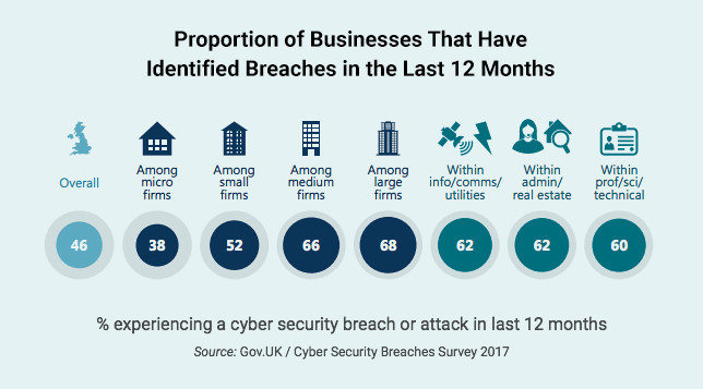 The UK government has released the results of national cybersecurity survey revealing nearly seven in ten large companies in the country have identified a breach or attack in the past 12 months. The report also says that businesses holding electronic personal data on customers were much more likely to suffer cyber breaches than those that do not (51 per cent compared to 37 per cent). “The most common breaches or attacks were via fraudulent emails—for example coaxing staff into revealing passwords or financial information, or opening dangerous attachments—followed by viruses and malware, such as people impersonating the organization online and ransomware. ... Of the businesses which identified a breach or attack, almost a quarter had a temporary loss of files, a fifth had software or systems corrupted, one in ten lost access to third party systems they rely on, and one in ten had their website taken down or slowed.”