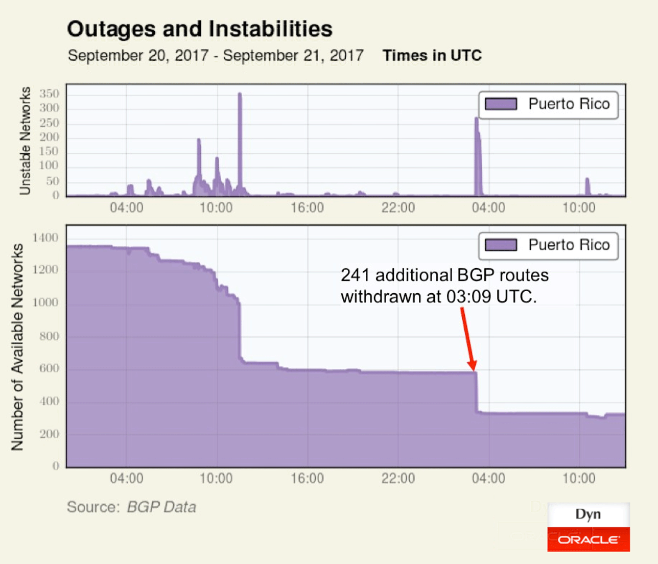 “The monitoring and measurement performed by Oracle Dyn allow us to see network availability issues in near-real time. By analyzing BGP data shared by network peers in over 700 locations around the world, as well as traceroutes performed from over 300 locations across the global Internet, we can identify network outages as they occur, and use our geolocation tools to understand where they have the most significant impact. Based on this data, as well as the analysis of data from our authoritative/secondary and open recursive DNS services, we were able to see the impact of Hurricanes Harvey, Irma, Jose, and Maria on Internet connectivity in affected areas. ... Admittedly, graphs showing Internet volatility resulting from hurricane damage in no way compare to the actual physical devastation caused by the storms. However, social media sites and applications, as well as the broader Internet, have come to play a greater role in preparedness, communications, and global dissemination of information, photos, and videos about the impacts of these natural disasters.”