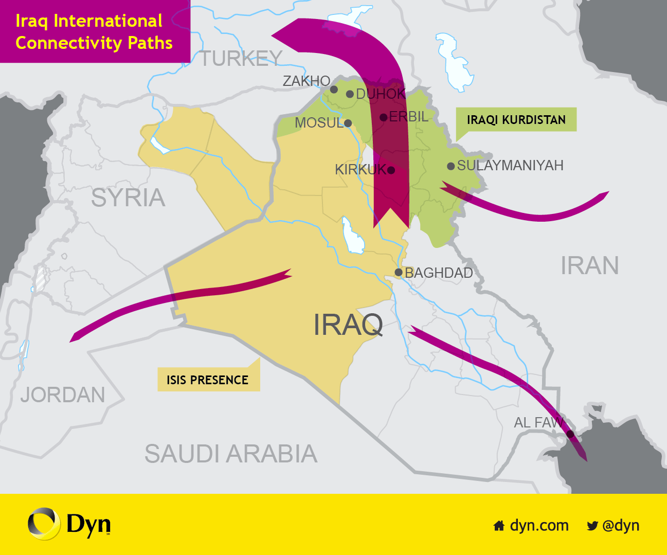 Iraq International Connectivity PathsThe Iraqi Kurdistan region contains four main cities: Erbil, Duhok, Zakho and Sulaymaniyah. Newroz covers the first three, while IQ Networks provides service in the last. However, it would be incorrect to simply classify these providers as city-level retail ISPs. They also carry significant amounts of traffic for the rest of the country.