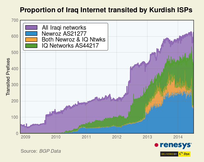 Overall growth of the Iraqi Internet over the last five and a half years.The graph right illustrates the overall growth of the Iraqi Internet over the last five and a half years. The total count of Iraqi networks (routed prefixes) is depicted in purple and the networks transited by either Newroz (blue), IQ Networks (green) or both (yellow) are overlaid as a stacked plot in the forefront. At last count, 73% of Iraq networks are routed through these two providers. And if you count unique IP addresses, these two Kurdish providers transit 86% of all Iraqi IP address space.