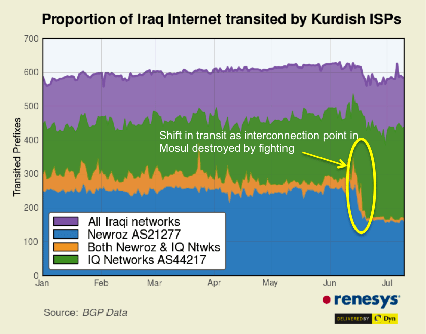 Editor’s Note: On the 25th of September, the northern autonomous region of Iraq known as Kurdistan voted to become an independent country. This vote has led to a current standoff between the central Iraqi government and the Kurdish Regional Government (KRG), with the Kurds threatening to cut off internet service into Iraq in retaliation for any punitive measures inflicted by Baghdad on the KRG. [1] The following analysis was written by Doug Madory of Oracle Dyn after ISIS took control of Mosul, Iraq in 2014. It describes how the internet of Iraq came to be dependent on international connections through telecoms based in Kurdistan.