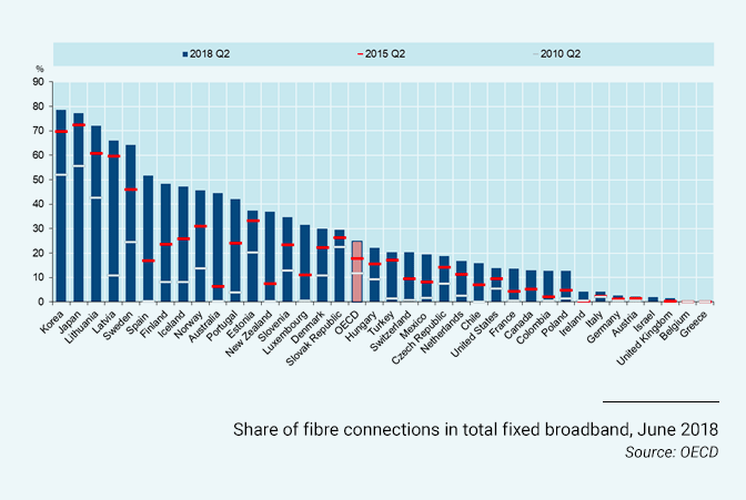 Organization for Economic Co-operation and Development (OECD) reports that the share of high-speed fiber in fixed broadband Internet connections in its member countries has risen to 25%, up from 12% eight years ago. OECD currently consists of 36 member countries spanning from North and South American regions to Europe and Asia-Pacific. OECD’s latest data shows a wide range between countries, however: “The share of fiber in total broadband [range] from above 70% in Korea, Japan and Lithuania to below 10% in Greece, Belgium, the United Kingdom, Israel, Austria, Germany, Italy and Ireland ... The highest growth in fiber over the past year has been seen in Ireland, Belgium and Australia with fibre subscriptions up 218%, 71% and 70% respectively.”