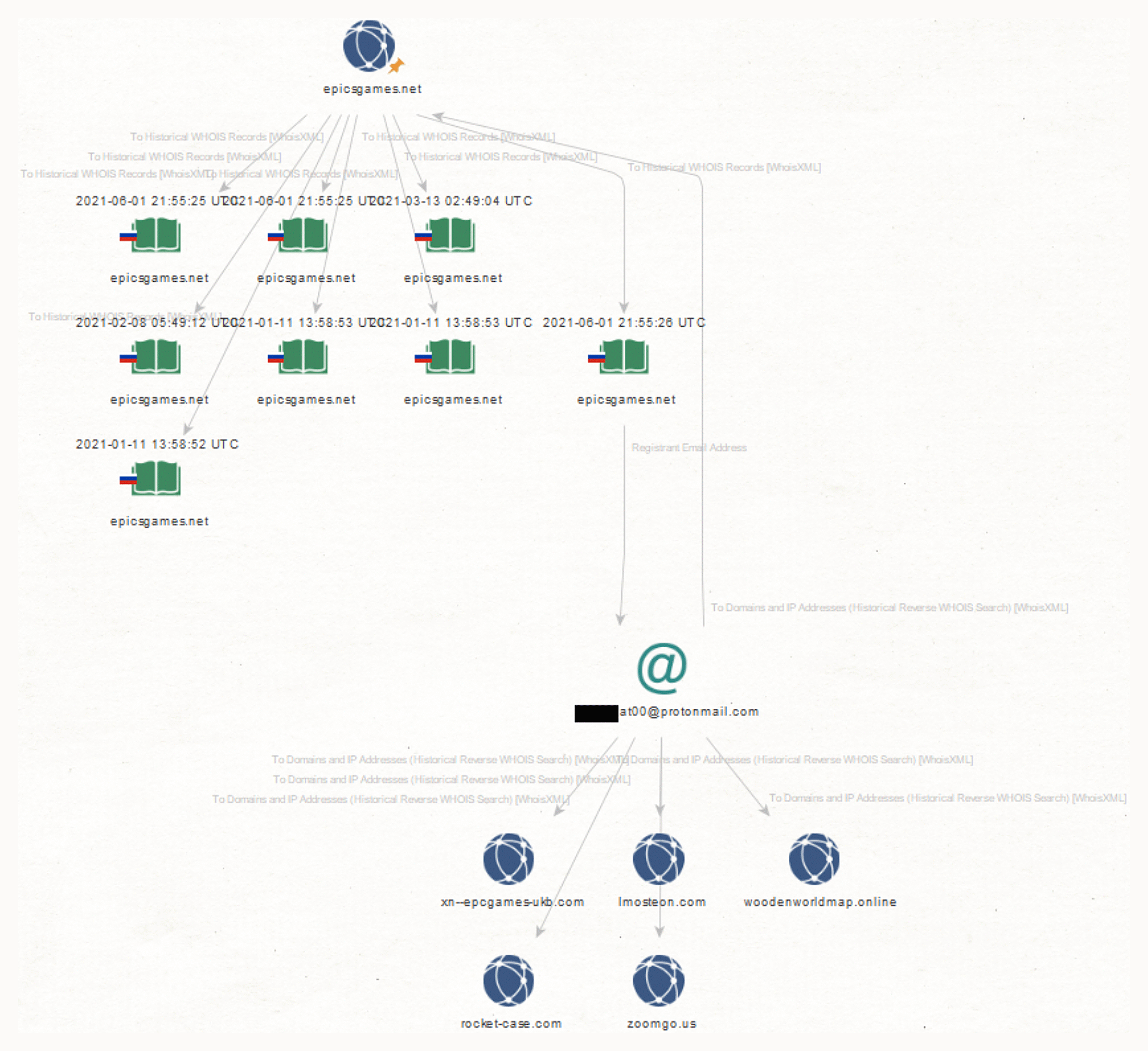 While many of the domains had redacted WHOIS records, a few of the registrant email addresses remained public. Take, for example, epicsgames[.]net whose registrant email address is *****lat00@protonmail[.]com (a few characters hidden for privacy). The Maltego Historical Reverse WHOIS Search transform reveals that five other domains had the same registrant email address.