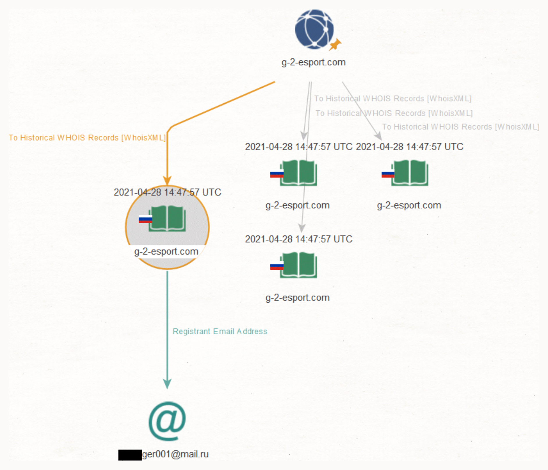 Another example is g-2-esport[.]com, whose registrant email address *****ger001@mail[.]ru is shared by 30 other domain names.