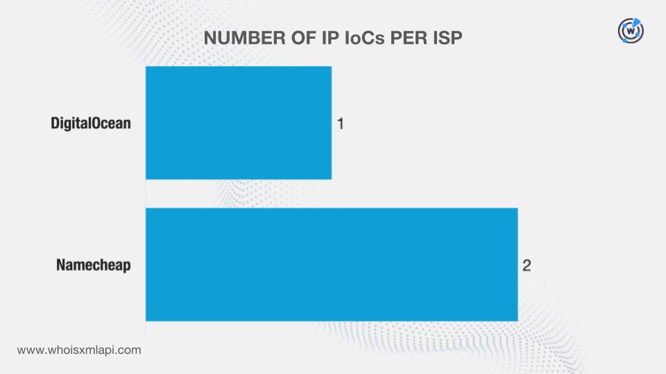 Next, we queried the domains named as IoCs on DNS Lookup API and discovered that three resolved to six unique additional IP addresses (i.e., not on the IoC list).
