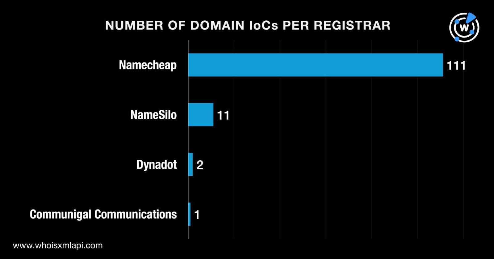 They were split among four registrars led by Namecheap, which accounted for 111 domains. NameSilo came in second place with 11 domains. Dynadot placed third with two domains. Finally, Communigal Communications accounted for one domain.