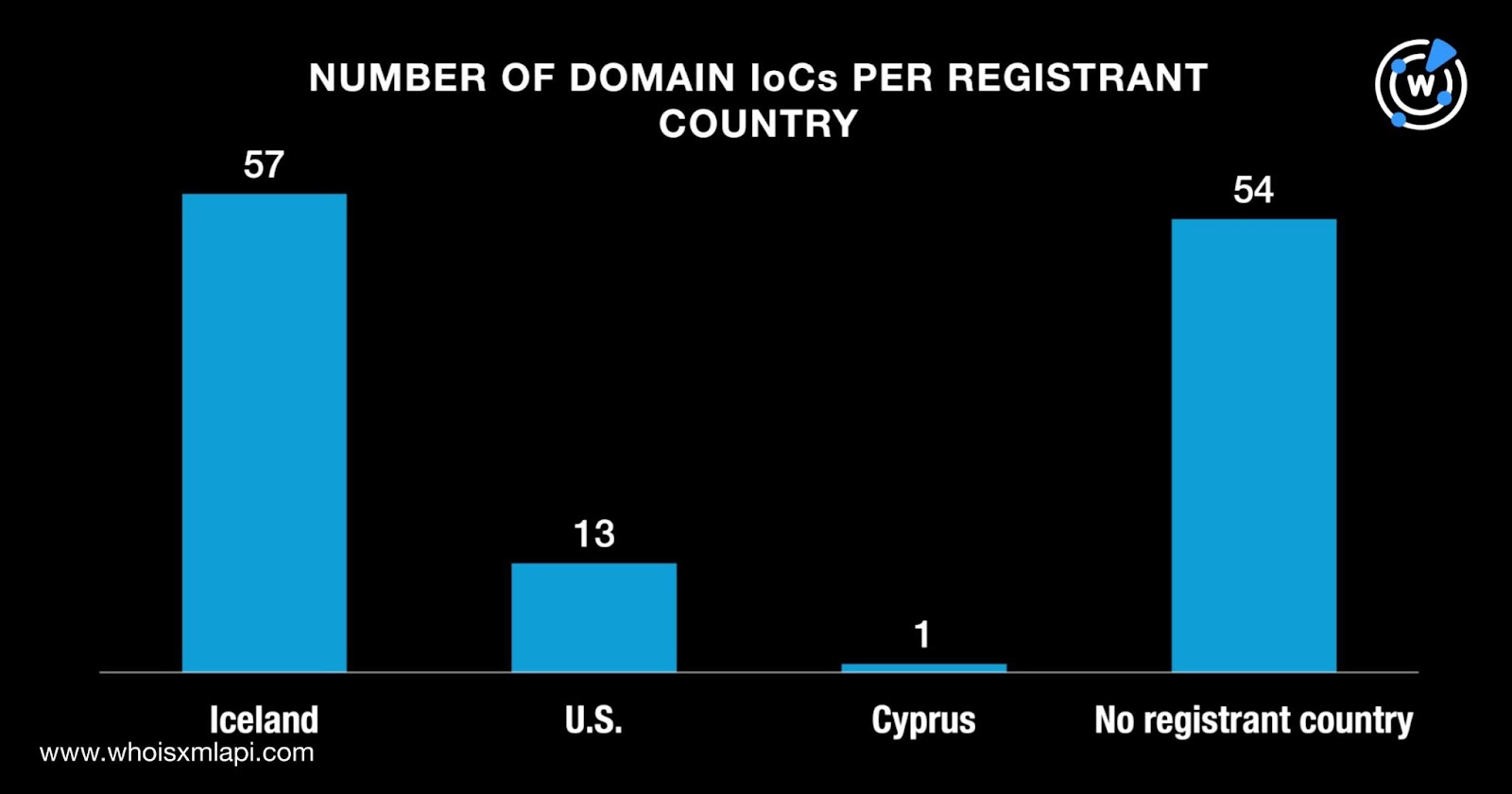 Only 71 of the 125 domains had registrant countries on record. They were registered in three countries topped by Iceland, which accounted for 57 domains. The U.S. took the second spot with 13 domains. Cyprus placed third with one domain. The remaining 54 domains did not have registrant countries in their current WHOIS records.