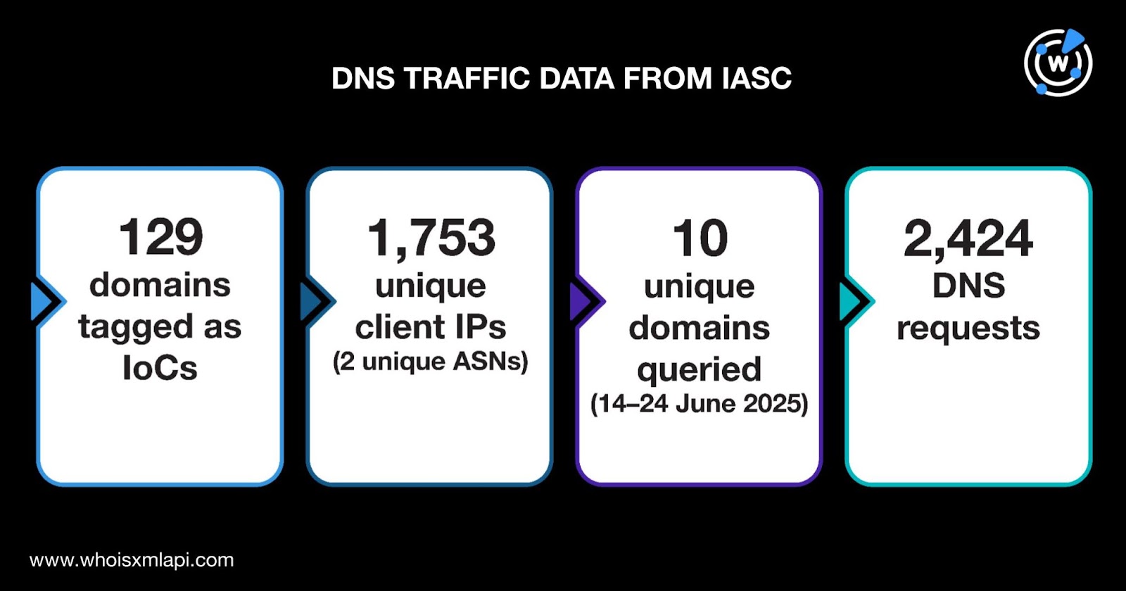 Using sample DNS traffic data our researchers obtained from the IASC, we further analyzed the 129 domains tagged as IoCs. The sample data revealed that 1,753 unique client IP addresses tied to two unique AS numbers queried 10 distinct domains on 14—24 June 2025 via 2,424 DNS requests.