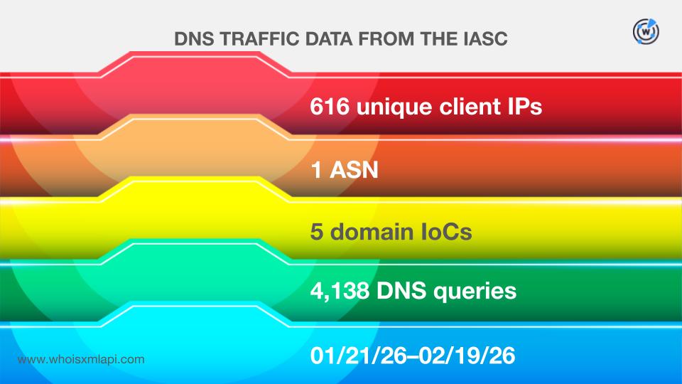 Sample network traffic data from the IASC, for one, revealed that 616 unique client IP addresses under a single ASN communicated with five of the domains tagged as IoCs via a total of 4,138 DNS queries made between 21 January and 19 February 2026.