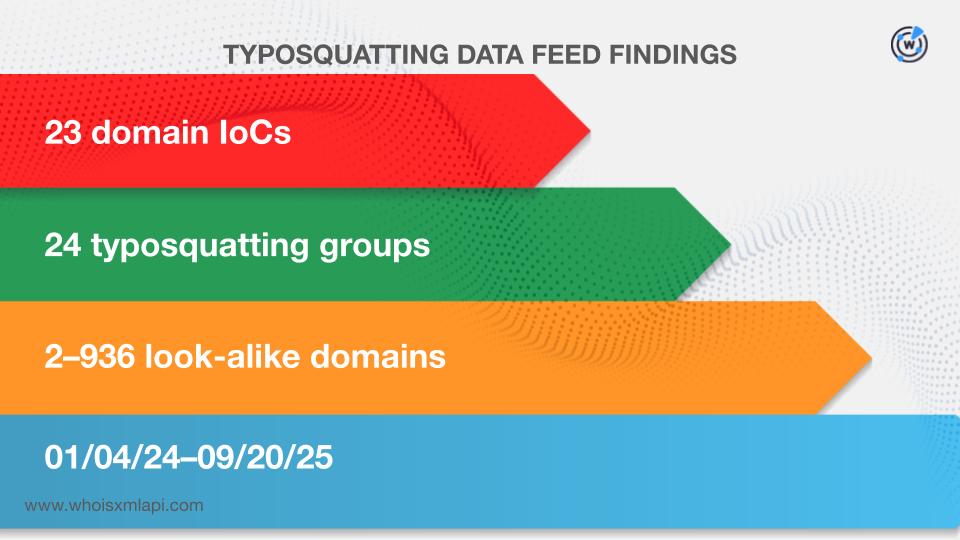 We sought to find out if any of the 104 domains named as IoCs appeared in the Typosquatting Data Feed and discovered that 23 were part of 24 typosquatting domain groups. Each was bulk-registered with 2—936 look-alikes between 4 January 2024 and 20 September 2025.