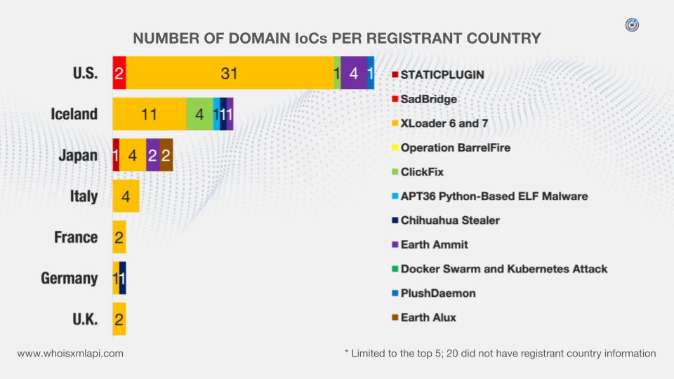 While 20 did not have registrant countries on record, the remaining 84 domains were registered in 15 different countries.