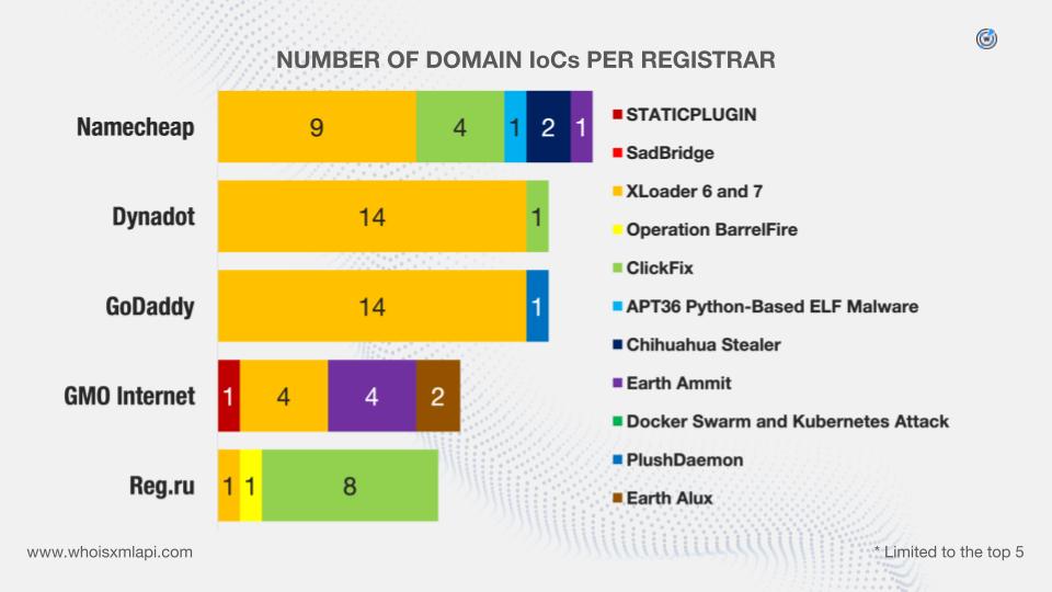We then queried the 104 domains classified as IoCs on WHOIS API and discovered that: