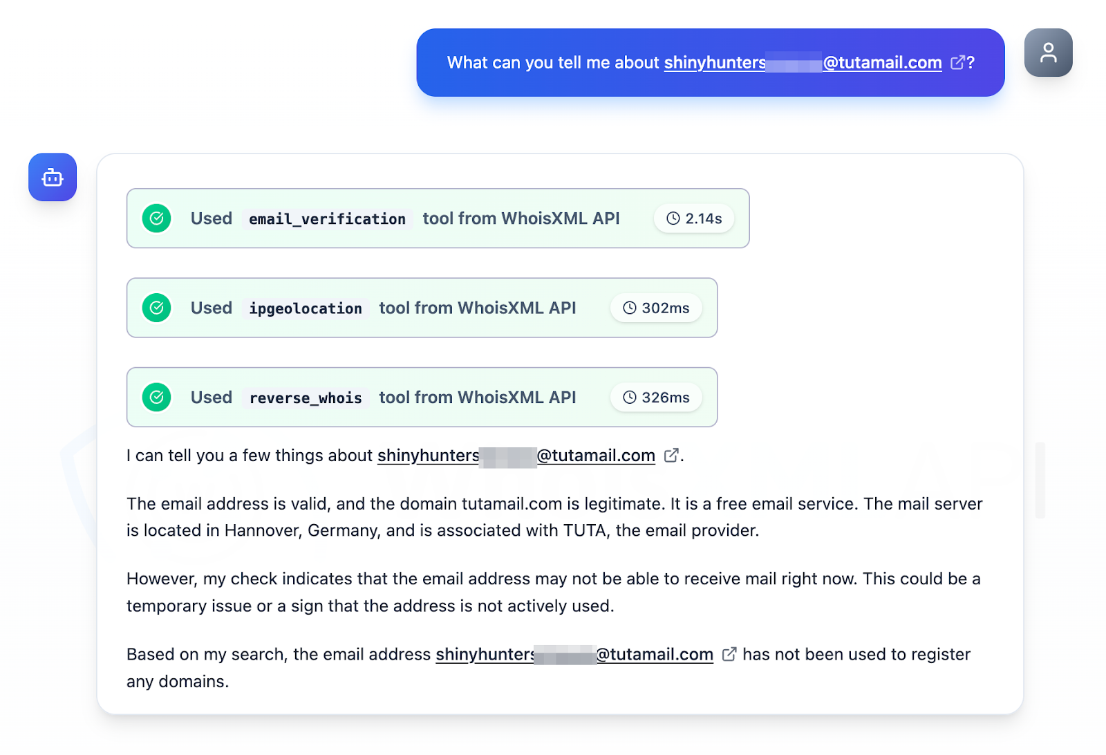 We examined the three email addresses identified as IoCs by querying them on Jake AI. The tool revealed that while they were all valid email addresses, they could not receive messages at present. None of them have also been used to register any domain, excluding them from our hunt for new artifacts.