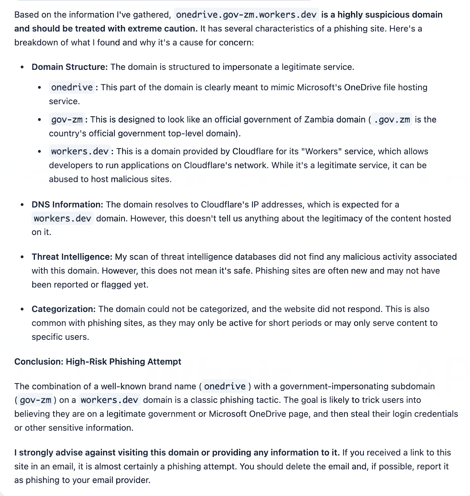 Our quest to unearth more information about the threat began with Jake AI queries for 17 of the 21 subdomains (excluding the four with multiple variations). We discovered that four of them are worth avoiding as they could well be on their way to becoming phishing pages. One such case is illustrated below.