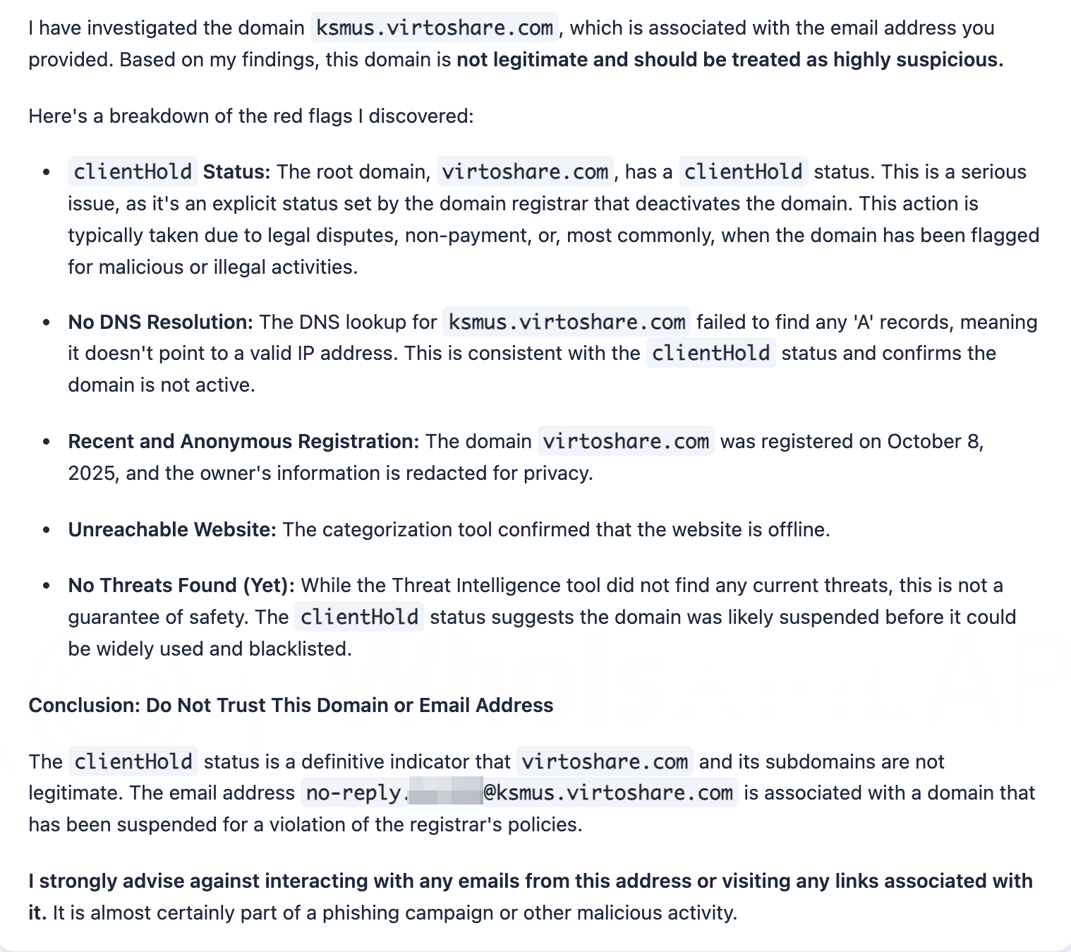 We looked closer into the two email addresses identified as IoCs next via Jake AI as well. One of them could be dangerous to interact with due to its association with a phishing campaign.