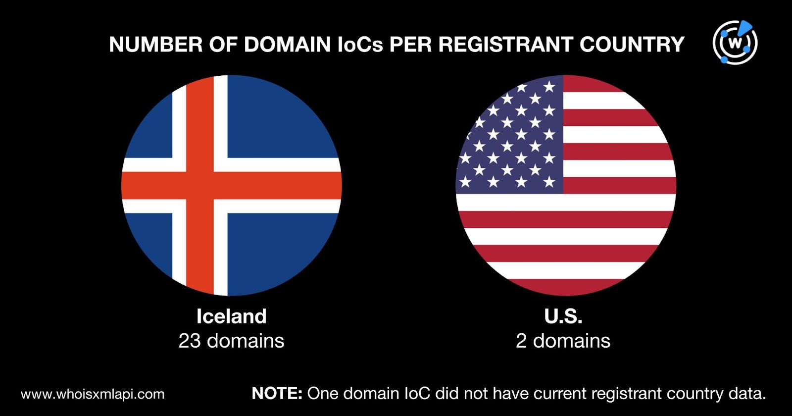 While one of the 26 domains did not have a registrant country on record, the 25 remaining ones were split between two countries. Specifically, 23 domains were registered in Iceland while two were registered in the U.S.