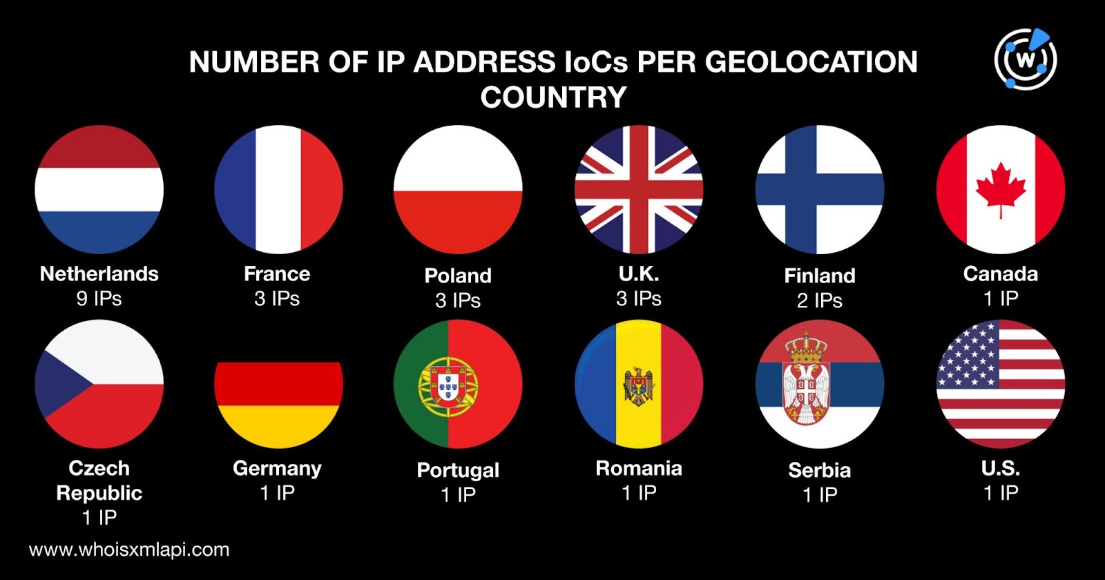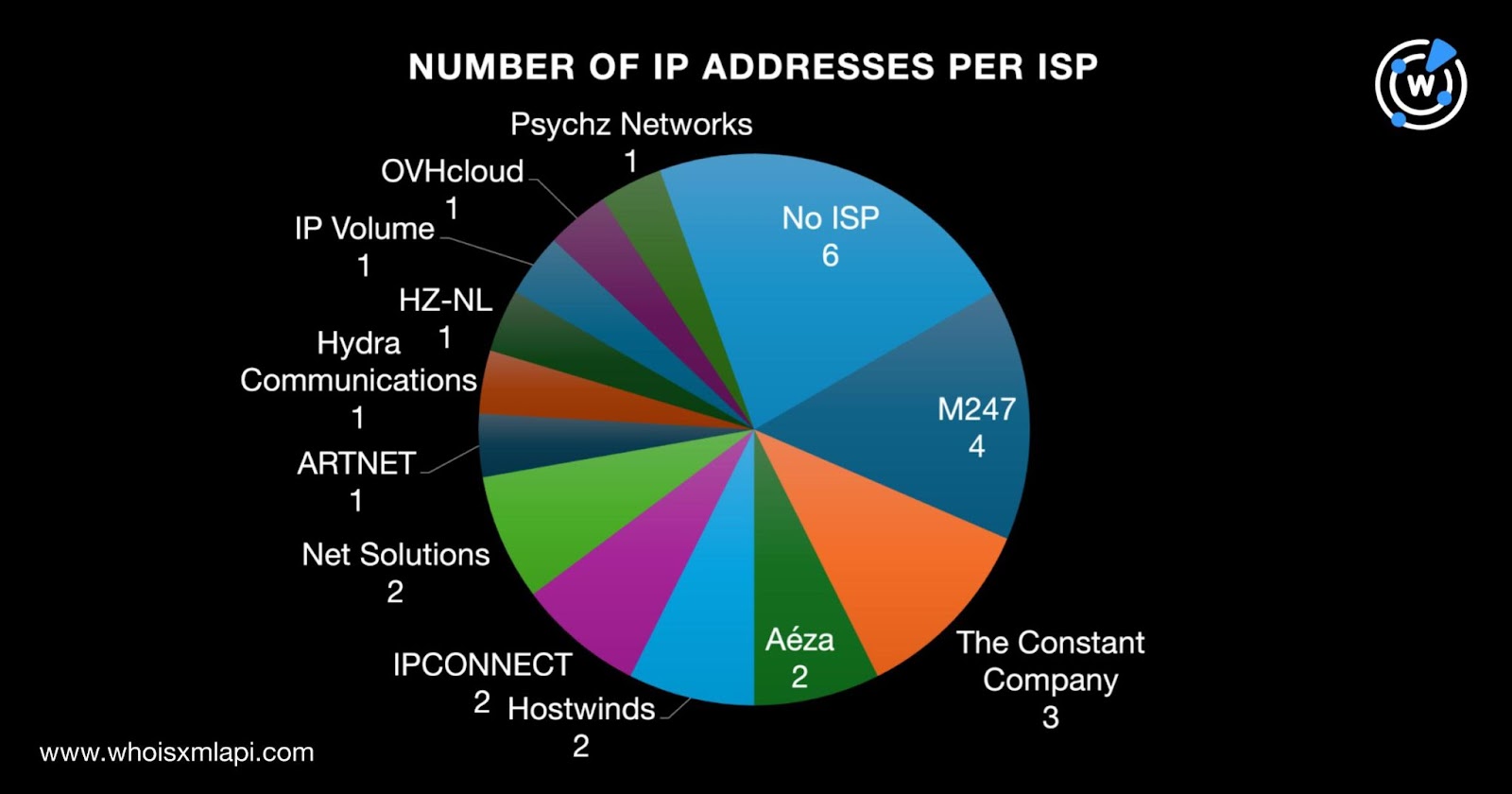 Only 21 of the 27 IP addresses had ISPs on record. Specifically, four IP addresses were administered by M247. The Constant Company administered three IP addresses while AƩza, Hostwinds, IPCONNECT, and Net Solutions administered two each. Finally, one IP address each was administered by ARTNET, Hydra Communications, HZ-NL, IP Volume, OVHcloud, and Psychz Networks.