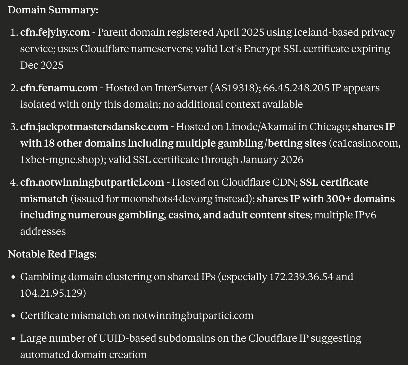 While we did not plan to use the four subdomains for our new artifact hunt, we still sought out more information on them. We thus used the WhoisXML API MCP Server to gather said information. The prompt “Get all data for cfn.fejyhy.com, cfn.fenamu.com, cfn.jackpotmastersdanske.com, and cfn.notwinningbutpartici.com” enabled us to determine that: