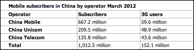 As of March 2012 the combined total subscribers of the top three Chinese mobile operators—China Mobile, China Unicom, China Telecom—is now 1,012.5 million, according to mobiThinking’s arithmetic.Sponsored byVerisign