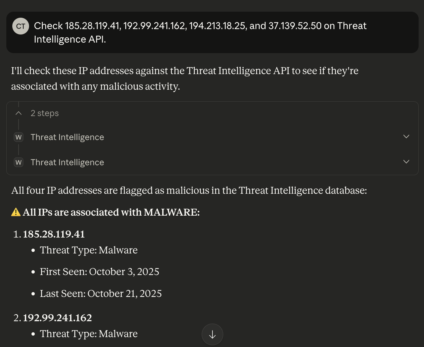 A Threat Intelligence API query via the WhoisXML API MCP Server for the four additional IP addresses revealed that all of them have been weaponized for malware distribution. We used the prompt “Check 185.28.119.41, 192.99.241.162, 194.213.18.25, and 37.139.52.50 on Threat Intelligence API.”