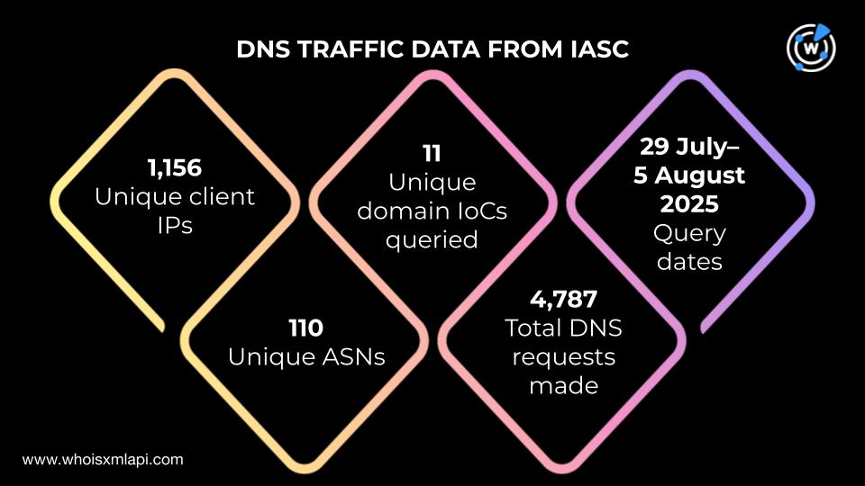 Sample DNS traffic data from IASC revealed that 1,156 unique client IP addresses under 110 unique Autonomous System numbers (ASNs) communicated with 11 unique domains identified as IoCs via 4,787 DNS queries made between 29 July 2025 and 5 August 2025.
