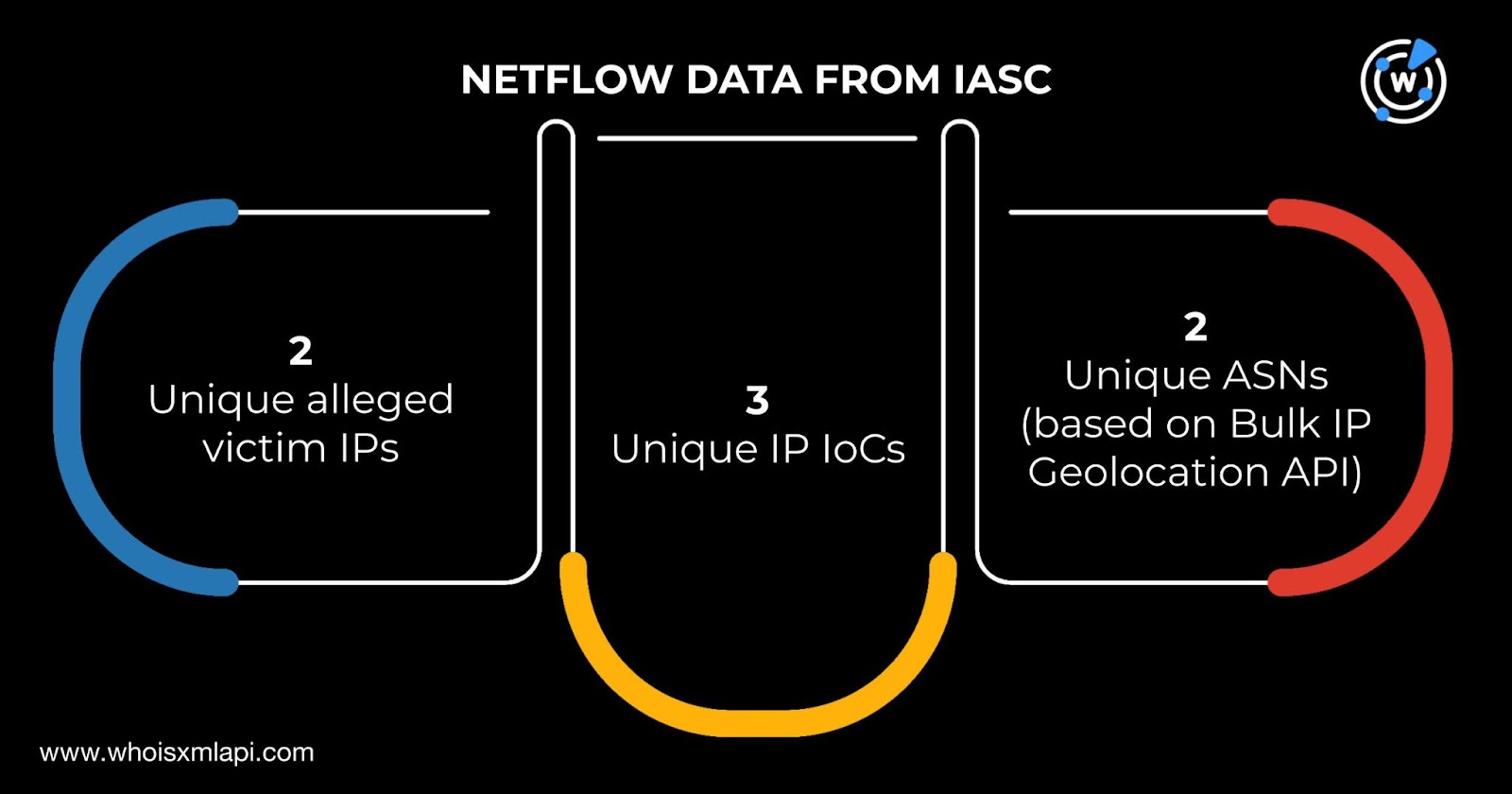 Another set of IASC data showed that two unique alleged victim IP addresses communicated with three unique IP addresses identified as IoCs under two unique ASNs based on the results of a Bulk IP Geolocation Lookup query.