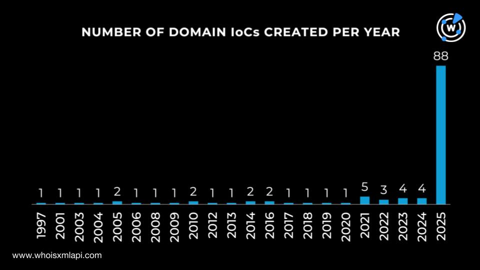 Next, we queried the 156 domains identified as IoCs on Bulk WHOIS API and discovered that:
