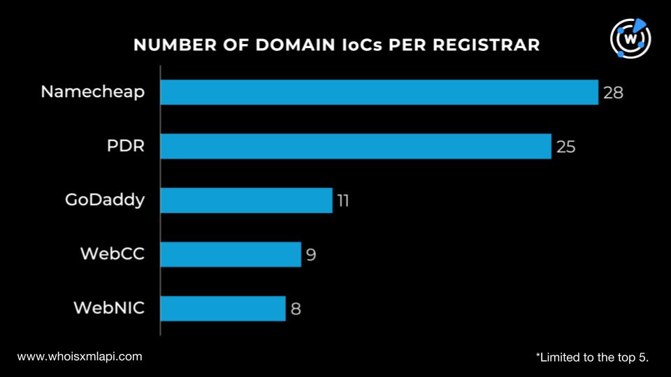 The top 5 registrars were Namecheap, which accounted for 28 domains; PDR for 25; GoDaddy for 11; WebCC for nine; and WebNIC for eight. The rest of the 44 domains were spread across 30 other registrars. They comprised OPENPROV-RU (five domains); NameSilo (four domains); NiceNIC (three domains); Bluehost, Global Domain Group, GMO Internet, Porkbun, and Wild West Domains (two domains each); and Amazon, CentralNIC, Cosmotown, Divido, Dreamscape Networks International, Dynadot, eNom, Eranet International, Gostovanje in Domene, Hello Internet, Hosting Concepts, Hostinger Operations, Instra, Internet Domain Service, Isimtescil Bilisim, Prado Ramiro Sebastian, R01-SU, Reg.ru, Squarespace Domains, Tucows, United-Domains, and URL Solutions (one domain each).