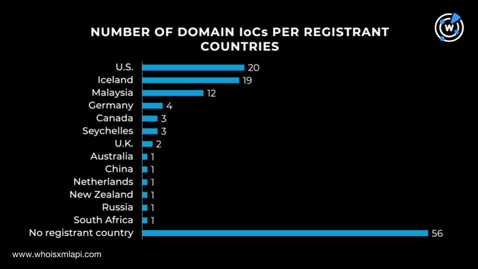 While 56 domains did not have registrant countries on record, 69 were spread out among 13 nations. A total of 20 domains were registered in the U.S.; 19 in Iceland; 12 in Malaysia, four in Germany; three each in Canada and Seychelles; two in the U.K.; and one each in Australia, China, the Netherlands, New Zealand, Russia, and South Africa.