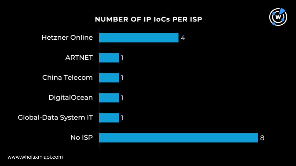 While eight IP addresses did not have ISPs on record, the rest were distributed among five ISPs. Hetzner Online accounted for four IP addresses while ARTNET, China Telecom, DigitalOcean, and Global-Data System IT accounted for one each.