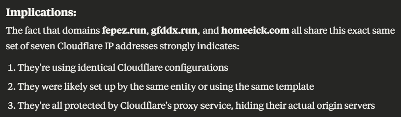 The results showed that the domains fepez[.]run, gfddx[.]run, and homeeick[.]com all used the Cloudflare IP addresses 104[.]21[.]16[.]1, 104[.]21[.]32[.]1, 104[.]21[.]48[.]1, 104[.]21[.]64[.]1, 104[.]21[.]80[.]1, 104[.]21[.]96[.]1, and 104[.]21[.]112[.]1 in May 2025.